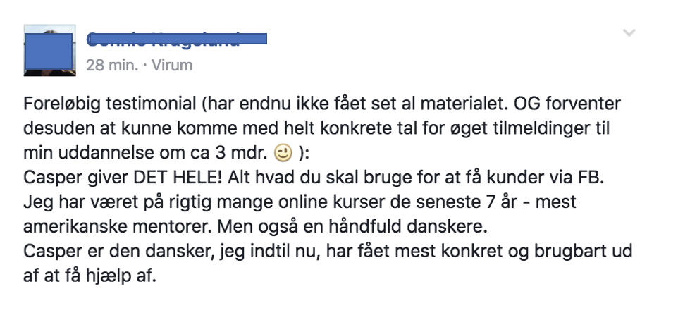 "Jeg kan varmt anbefale og ta' med her på kurset og få optimeret dine rutiner på Facebook, spar tid og spar penge og få flere kunder."